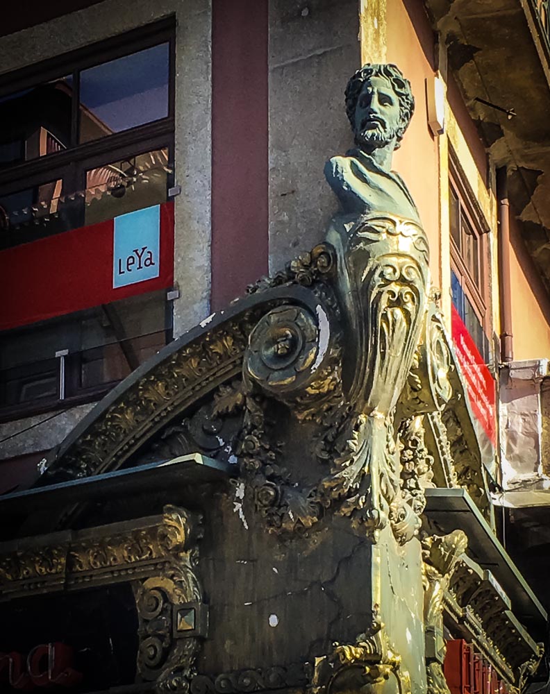 Many Art Nouveau buildings today are shops and cafés. Rua de Santa Catarina, which is the main pedestrianised shopping street in Porto, is no exception. On the corner, you start with Reis & Filhos, a clothing shop for men. Not only its facade is wonderful – the inside as well. Just across, the figurehead of LeYa na Latina bookshop tries to compete with the black austerity of the Reis & Filhos storefront. Further up the street, you have the newly renovated Hotel Moov where only the facade bears witness to its Art Nouveau prelude.